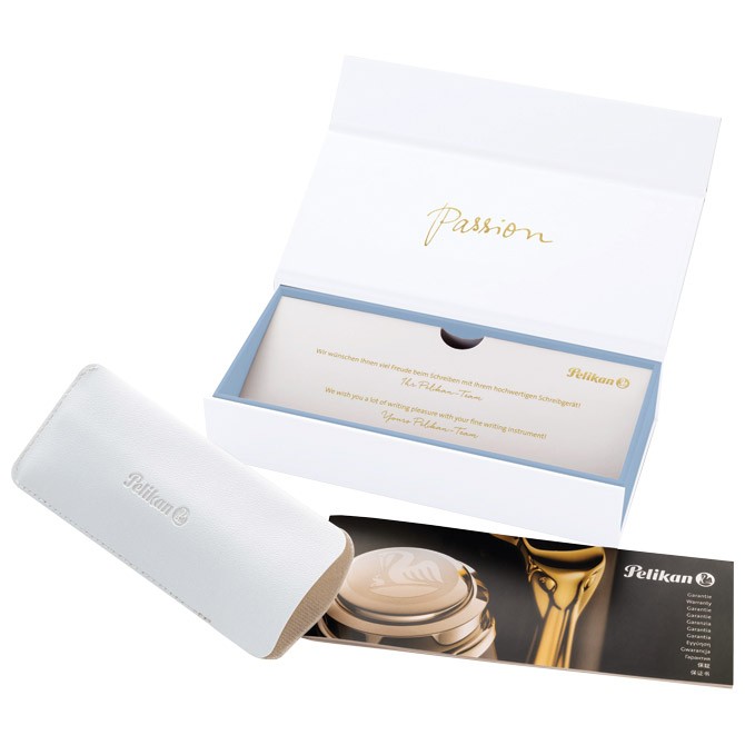 meka pastelno plava meša se sa bisernim efektima u telu olovke, dočaravajuc´i sve nove varijacije nijansi; meko plavi materijal je poluprovidan, omoguc´avajuc´i uvid u unutrašnjost olovke; u kombinaciji sa belom plemenitom smolom i pozlac´enim dekorativnim elementima, rezultat je balans između plemenitog dizajna i osvežavajuc´eg utiska boja; olovka je završena sa 24-karatnim pozlac´enim ukrasnim elementima kao što su prstenovi i Pelikan kopča za vrh olovke; uložak 337M crni, širina ispisa 1,0 mm; u specijalnoj beloj poklon kutiji G30