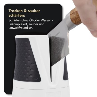 Kompaktan i izuzetno efikasan oštrač za sve vrste naoštrivih noževa. Oštri istovrenemo obe strane prostim provlačenjem noža kroz prorez u kome su dijamantske površine za oštrenje.