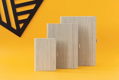 Notes • Format B5 • 192 strane • Knjižni blok u linije • Krem papir 80 g/m² • Korica od termoosetljive eko kože sa teksturom drveta • Zaobljene ivice • Elastična traka • Držač za olovku • Proizvedeno u Evropi
