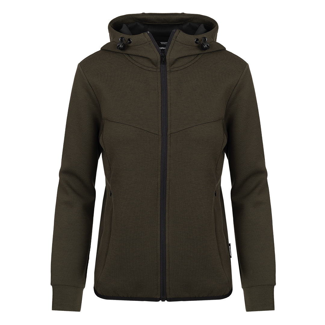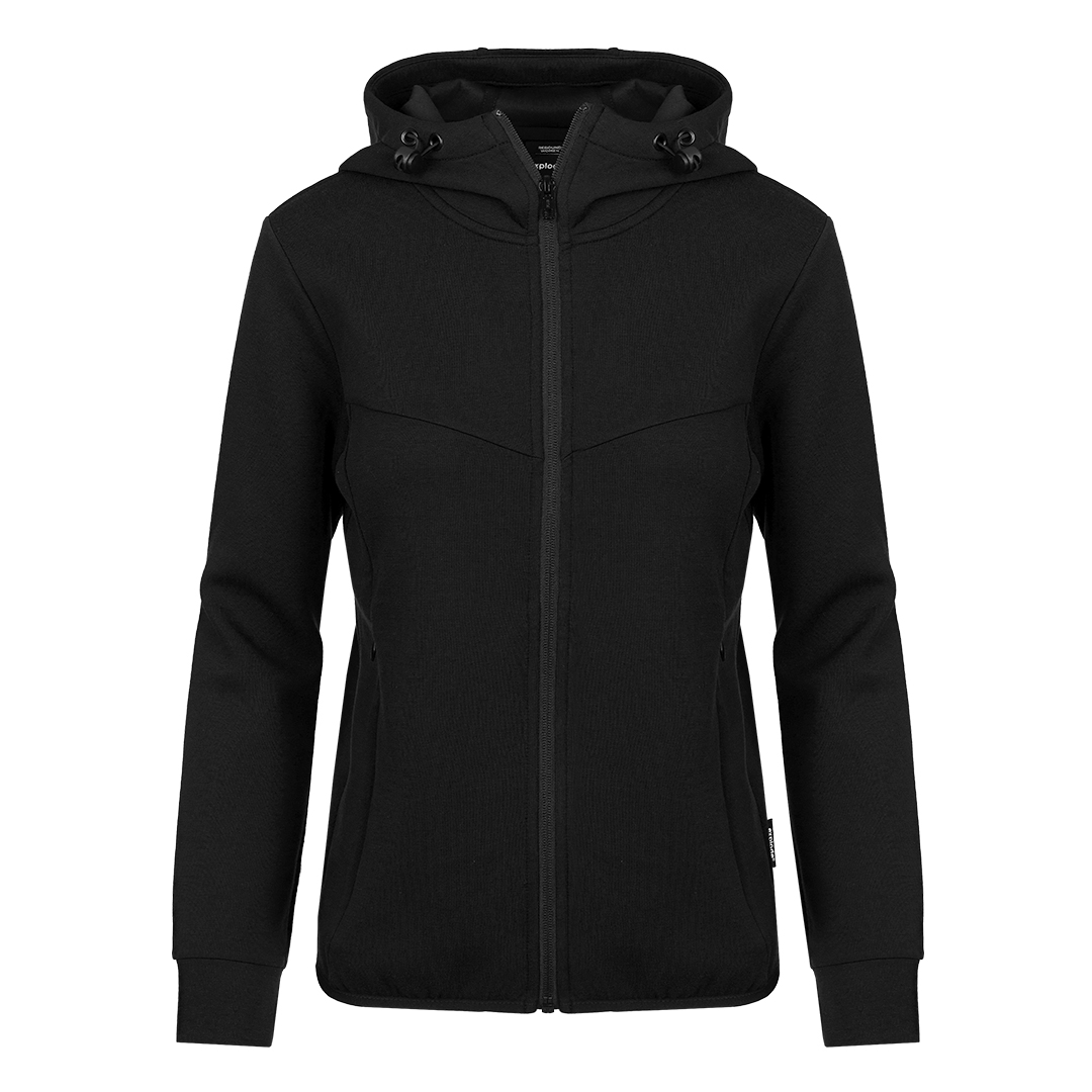 Ženska dukserica sa kapuljačom i punim rajsferšlusom • Sirovinski sastav: poliester, reciklirani poliester, viskoza, elastin • Gramatura: 300 g/m² • Atletska konstrukcija • Elastičan i stabilan materijal • Mekana i prijatna na dodir • Održivi sastav • Podesiva kapuljača • Diskretni prednji džepovi sa skrivenim otvaranjem • Elastične paspule na rukavima i dnu • Pogodna za aktivna radna i promotivna okruženja • Dostupna u muškoj verziji