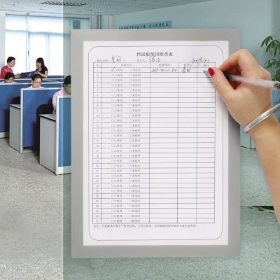 Potpuno samolepljiva providna pozadina. Prednja strana od PVC-a debljine 0,3 mm sa okvirom širine 15 mm koja je otvorena u sredini tako da je ubačeni dokument slobodan za pisanje. Jedna kraća strana je fiksna a ostale tri strane se zatvaraju magnetom.