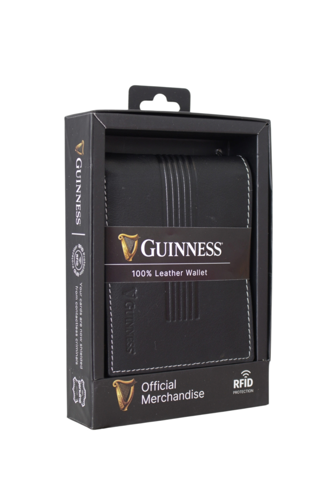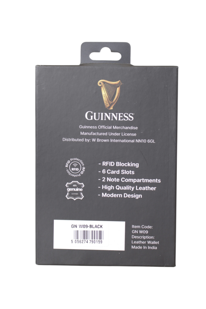 Premijum Guinness novčanik izrađen je od 100% prirodne kože vrhunskog kvaliteta, spajajući prepoznatljiv stil zvanične kolekcije sa modernim estetskim detaljima u vidu horizontalnih reljefnih linija. Unutrašnjost nudi visoku funkcionalnost kroz šest precizno dizajniranih pregrada za kartice i dva prostrana odeljka za novčanice, čime se obezbeđuje besprekorna organizacija. Maksimalna bezbednost digitalnih podataka garantovana je integrisanom RFID zaštitom, pružajući korisniku potpunu sigurnost protiv neovlašćenog skeniranja kartica. Dolazeći u luksuznom pakovanju Official Merchandise linije, ovaj model predstavlja vrhunski spoj dugovečnosti i suptilne elegancije, idealan za svakodnevnu upotrebu.