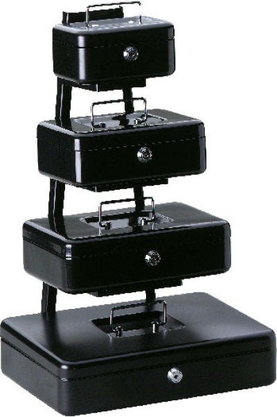 Prenosive kase za sigurno odlaganje novca ili važnih dokumenata. Kućište je izrađeno od čelika, a svaka kasa ima plastični uložak za sortiranje novčanica.