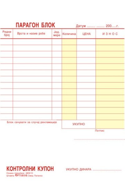 1. Naziv artikla: paragon blok