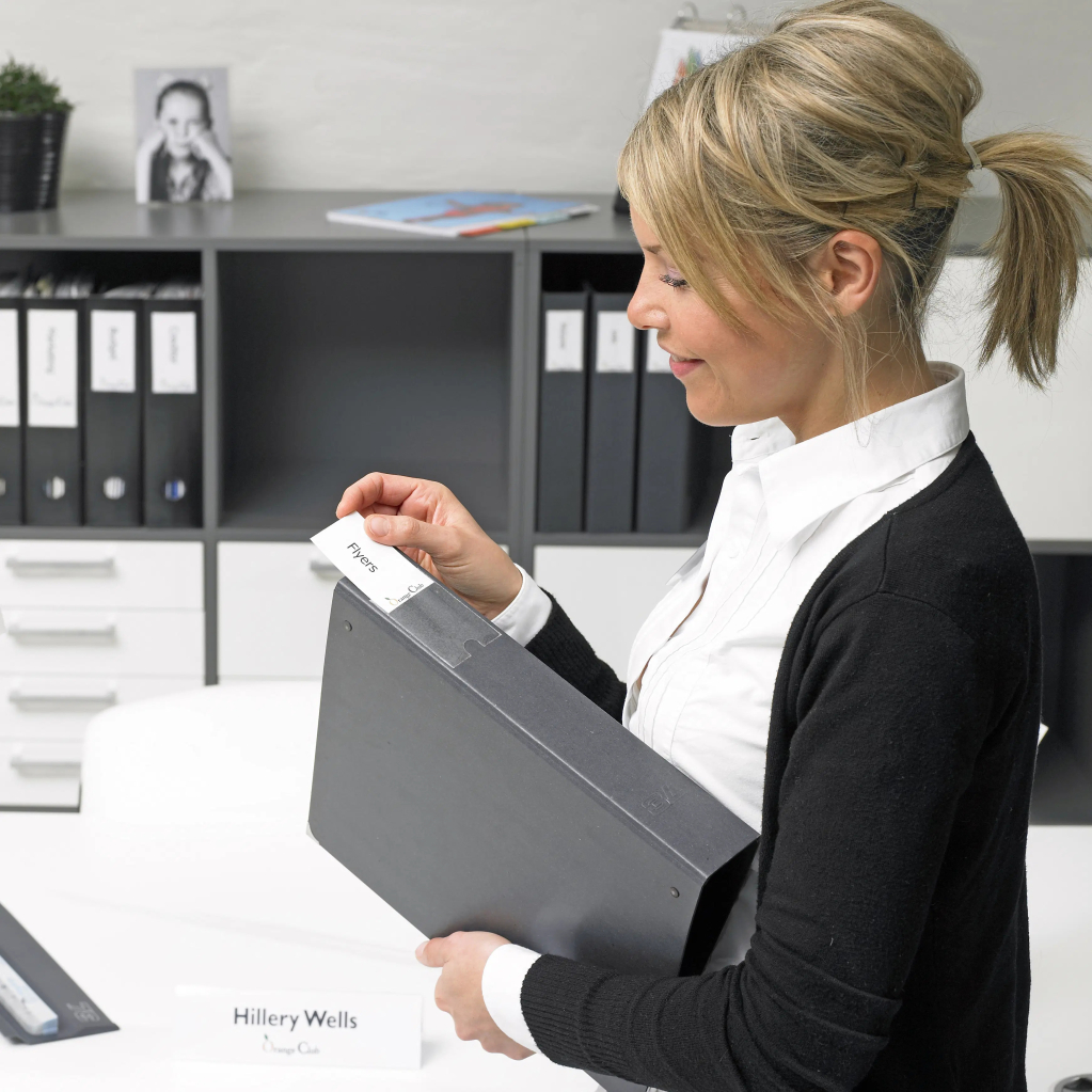 Organizujte svoju kancelariju i pratite sve svoje dokumente. Dizajnirani da vam omoguc´e kontrolu nad stalno promenljivim sadržajem vaših fascikli, registratora, kataloga i fioka, naši držači za etikete dolaze sa zamenljivim ulošcima za papir na kojima možete pisati ili štampati, i sa malim otvorima za prste kako bi se olakšalo uklanjanje i zamena uložaka za papir. 3L držači za etikete dostupni su u različitim veličinama