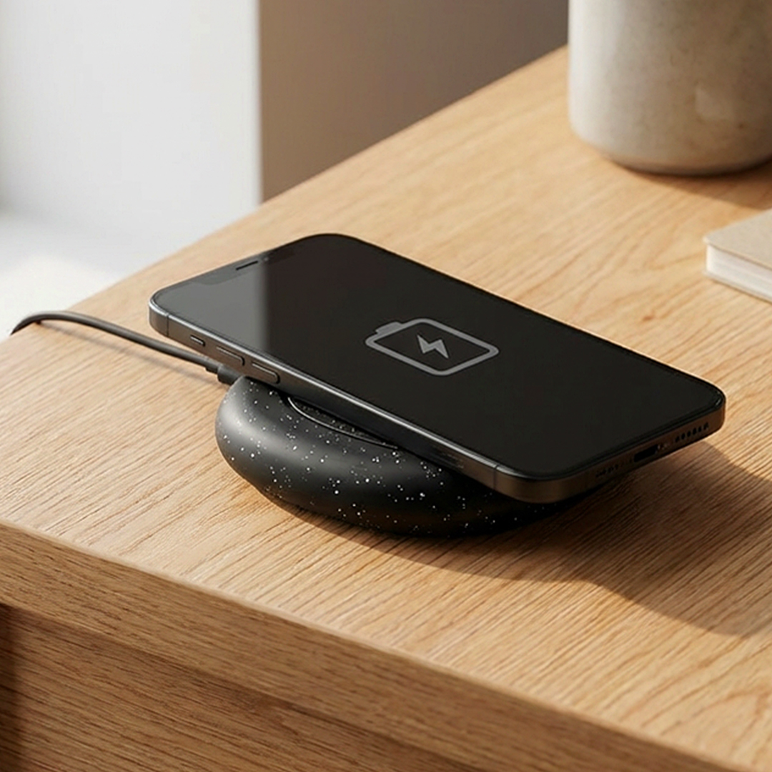 Bežični punjač snage do 15W namenjen punjenju mobilnih uređaja na radnom stolu ili u kancelariji. Izrađen je od kombinacije recikliranog kamena i plastike i kompatibilan je sa svim uređajima koji podržavaju Qi tehnologiju.