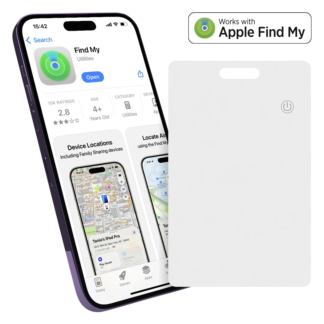 Kompatibilno sa Apple aplikacijom „FindMy“, praćenje vaših predmeta širom sveta, koristite zvučni signal za lociranje vašeg uređaja kada je u blizini, sa bežično punjivom baterijom