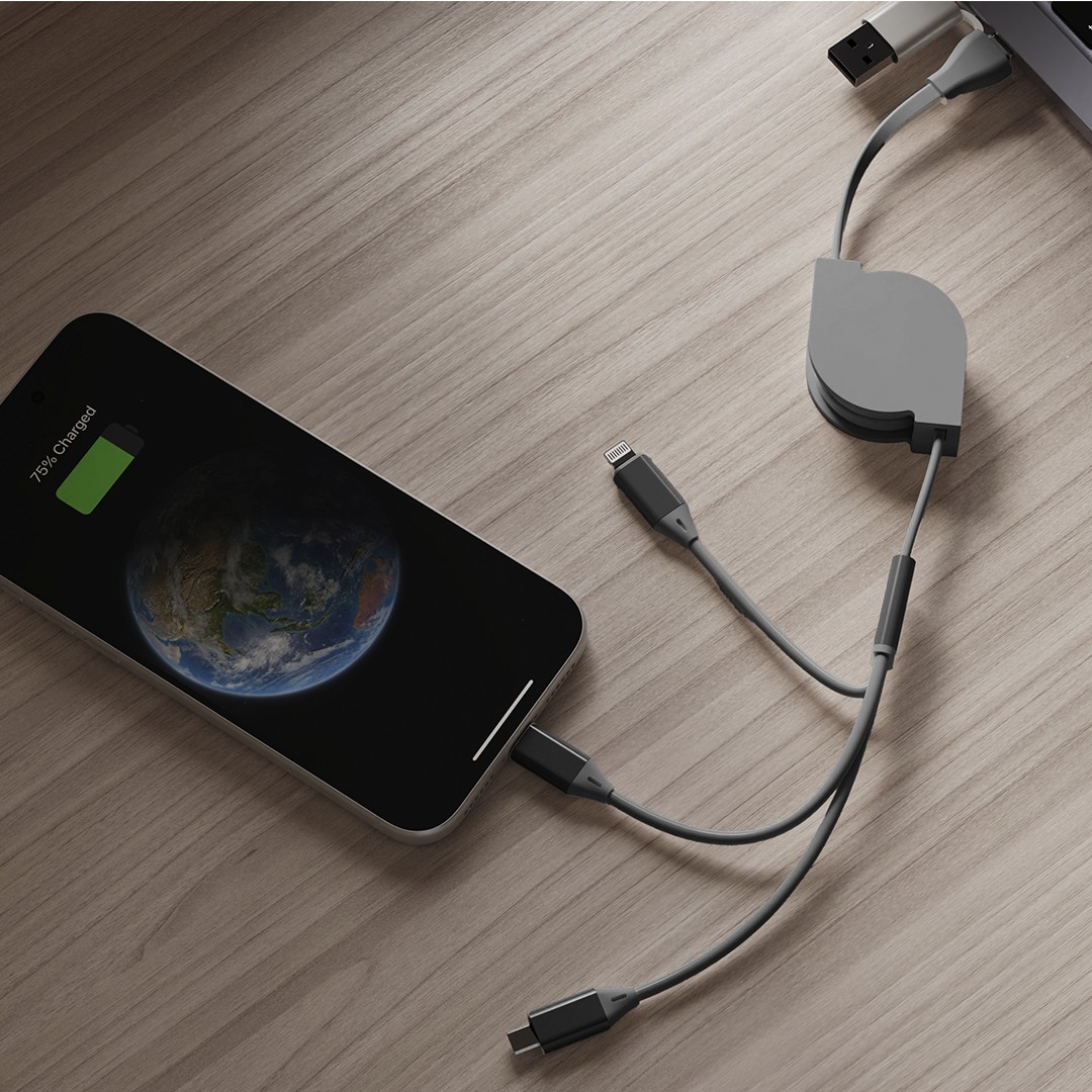 Materijal: plastika, aluminijum • Dužina kabla: 1 m • Tip kabla: uvlačeći (automatsko uvlačenje) • Ulaz: USB-A/Type-C • Izlazi: Micro-USB, Lightning, Type-C • Snaga punjenja: do 60 W (Type-C/Type-C) • Funkcije: punjenje i prenos podataka • Poklon pakovanje