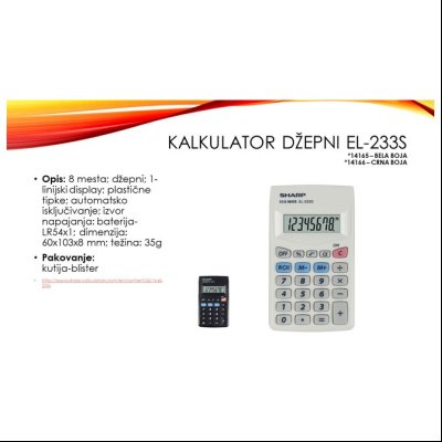 - Naziv Kalkulator džepni 8mesta Sharp EL-233S beli blister