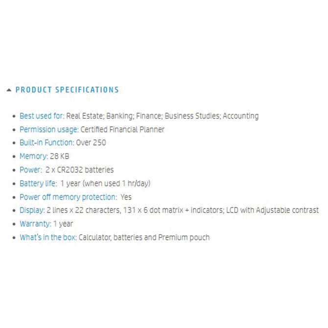 12 mesta; 170 funkcija (statističke, finansijske i matematičke); automatsko isključivanje nakon 5 minuta; zaštita memorije od isključivanja (memorijski registri 22); 1-linijski display; plastične tipke; metalni okvir displeja; izvor napajanja: baterija CR2032x2kom; trajanje baterije 1 godina (kod korišćenja 1h dnevno); dimenzija:145x81x15mm; težina:85g; pakovanje: blister; u pakovanju: kalkulator, baterije i zaštitni omot