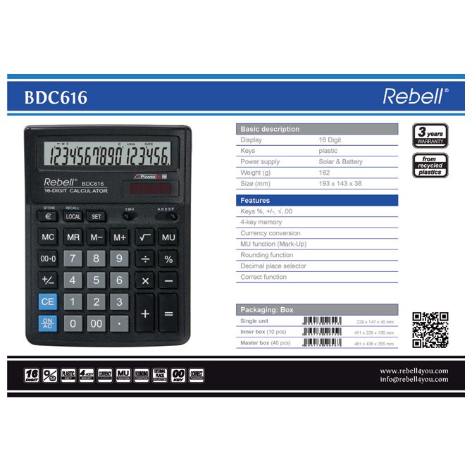 • Naziv Kalkulator komercijalni 16mesta Rebell RE-BDC616 BX crni