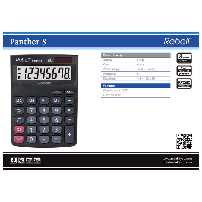 8 mesta; 1-linijski display; plastične tipke; dvostruki izvor napajanja: solarni + baterija; dimenzija: 120x143x29mm; težina: 94g; napravljeno od reciklirane plastike; garancija 3 godine