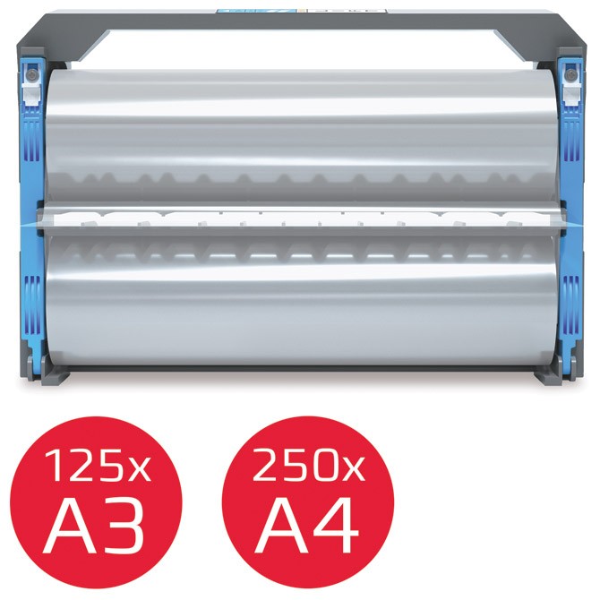 sjajna; u rolni na plastičnoj konstrukciji; debljina 75 mikrona; dužina 56,4m: plastificira format A3 125 kom, A4 250 kom