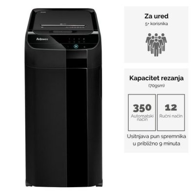 Profesionalni uništivač dokumenata za kancelarije koje svakodnevno obrađuju veću količinu papira. Ubaciš do 350 listova, zatvoriš i uređaj samostalno uništava dokumenta bez nadzora.- Proizvođač: FELLOWES