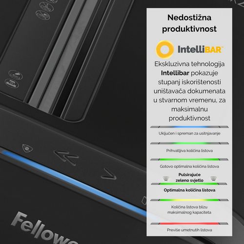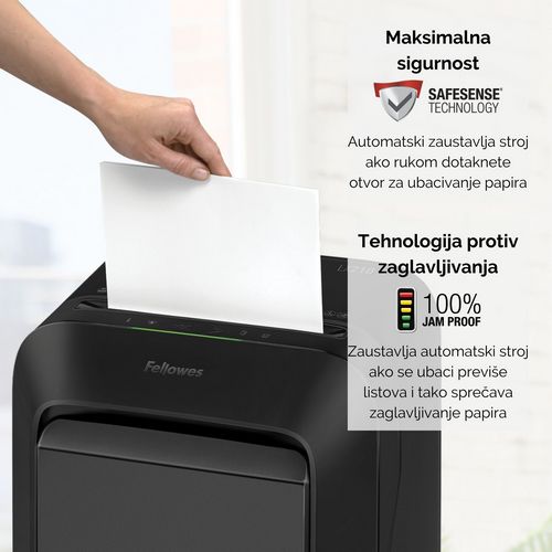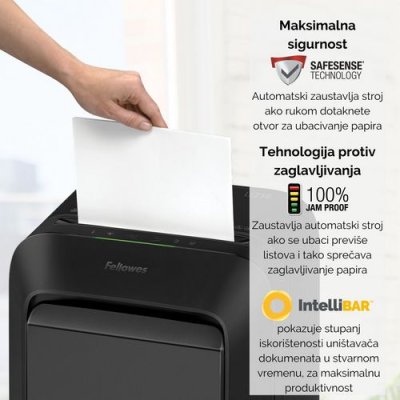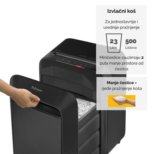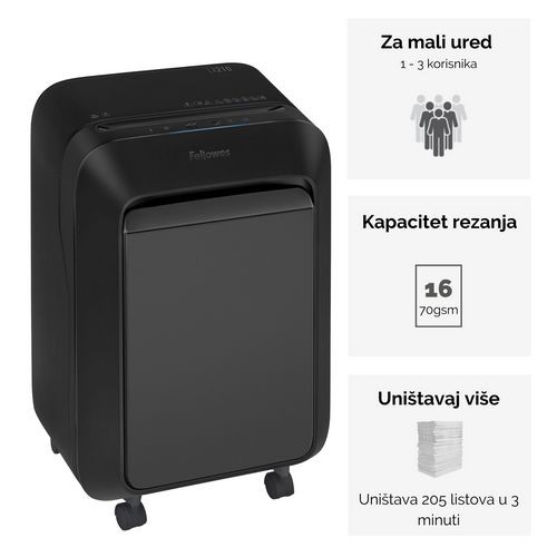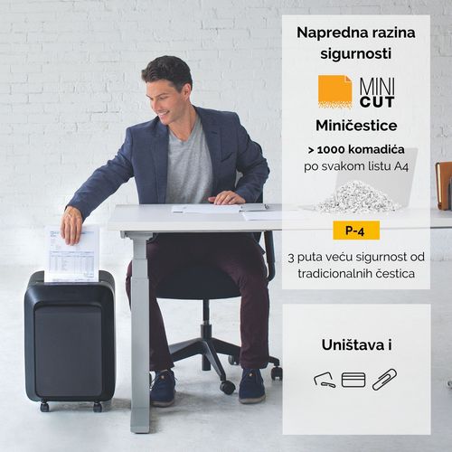 Kancelarijski uništivač dokumenata sa mini-cut sečenjem papira koji pruža viši nivo zaštite podataka od standardnih seckalica. Idealan za svakodnevni rad sa poverljivim dokumentima.- Proizvođač: FELLOWES