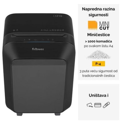 LX210 koristi mini-cut tehnologiju koja papir seče na znatno sitnije delove nego klasični strip-cut ili osnovni cross-cut modeli. To znači da dokument više nije moguće sastaviti.
