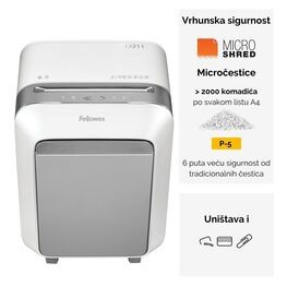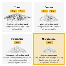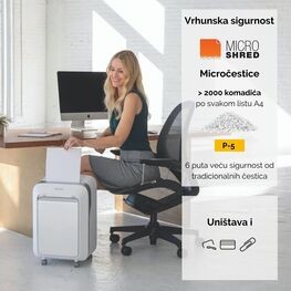 Kancelarijski uništivač dokumenata koji seče papir na izuzetno sitne čestice, namenjen firmama koje rade sa osetljivim podacima i ne žele kompromis u sigurnosti.