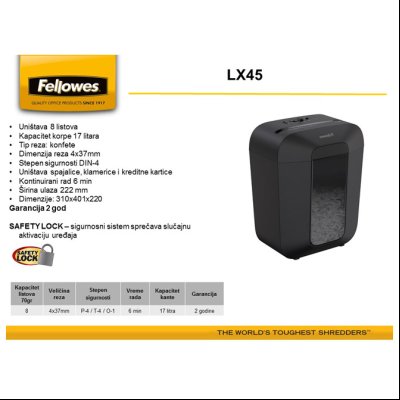 Treba ti Uništivač dokumentacije (konfete) LX45 Fellowes 4400501 crni? U Standard online prodavnici te čekaju ŠREDERI odličnog kvaliteta. Pogledaj online!- Proizvođač: FELLOWES