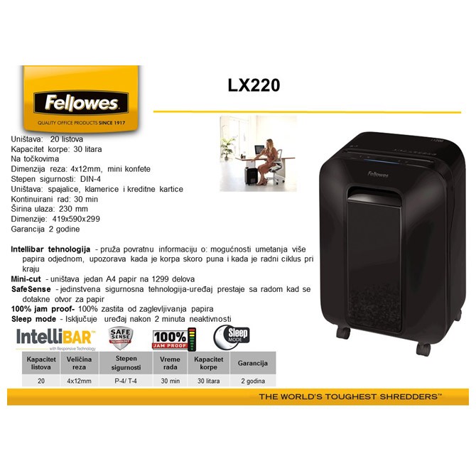 kapacitet: 20 listova; kapacitet korpe: 30 litara (oko 750 listova); mini uništavanje (svaki list papira formata A4 izreže u više od 1300 delova); dimenzije reza: 4x12 mm; širina ulaza: 230 mm; inovativna tehnologija Intellibar pruža povratnu informaciju o: mogućnosti umetanja više papira odjednom, upozorava kada je korpa skoro puna i kada je radni ciklus pri kraju; ima funkciju automatskog zaustavljanja i vraćanja unazad kada se stavi previše papira (100% Jam Proof); uređaj prestaje sa radom kada se dotakne otvor za papir (SafeSense tehnologija); Sleep Mode isključuje uređaj nakon 2 minuta neaktivnosti; vreme rada: 30 minuta; vreme hlađenja: 15 minuta; stepen sigurnosti: 4; osim papira uništava spajalice, klamerice i kreditne kartice; dimenzija: 419x590x299 mm; težina: 16,7 kg; 5 godina garancije na noževe; 2 godine garancije na uređaj